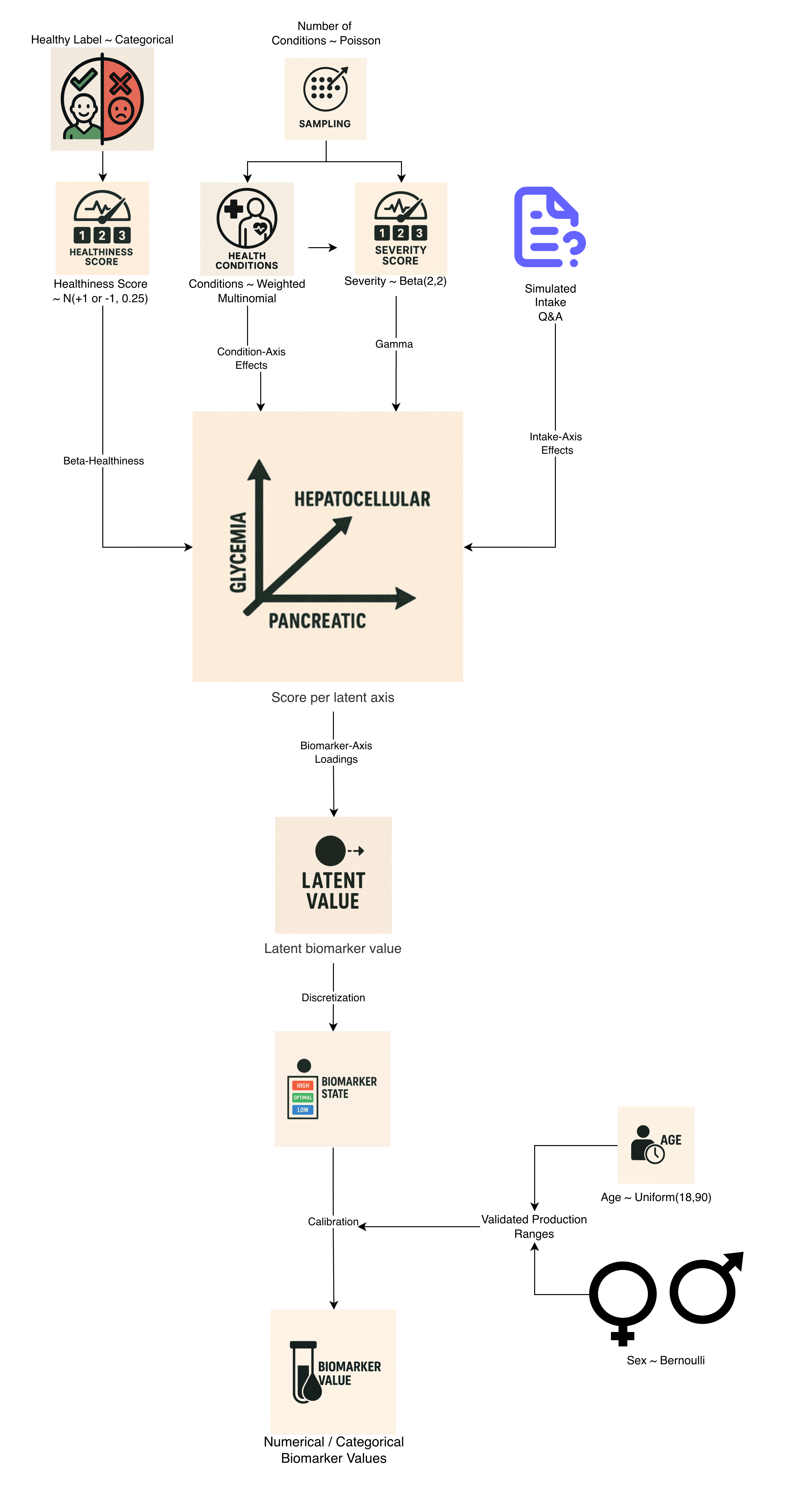 1η_axis2 = β_healthiness × H3 + Σ_i [ γ × E(axis, condition_i) × severity_i ] # condition pulls4 + Σ_j [ I(axis, q_j, a_j) × weight_j × intake_scale ] # intake effects5 + axis_bias6 + ε_axis, ε_axis ~ N(0, σ_axis^2)78 for 'i' conditions and 'j' intake question-answer pairs
