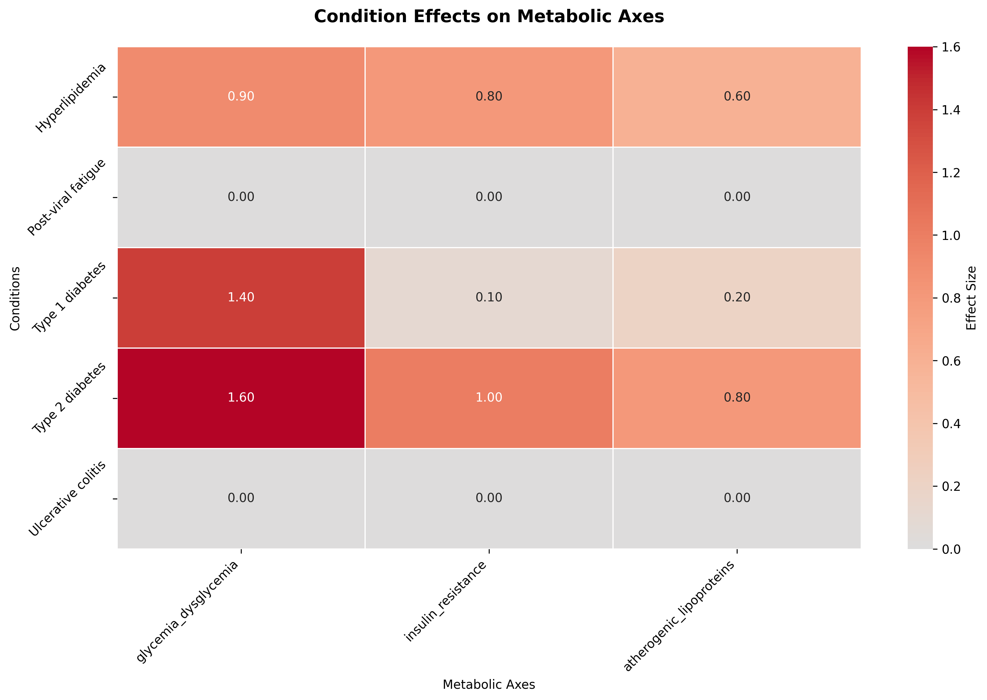 A higher condition-to-axis effect (E(axis, condition_i)) means the condition exerts a stronger pull on the corresponding latent axis, magnifying its role in the overall physiological profile. For example, a subset of the condition-to-axis effects matrix below shows that Type 2 Diabetes exerts a strong positive effect on the insulin_resistance axis, reflecting impaired insulin sensitivity, whereas Type 1 Diabetes has a smaller or even neutral influence since its pathology stems from insulin deficiency rather than resistance.