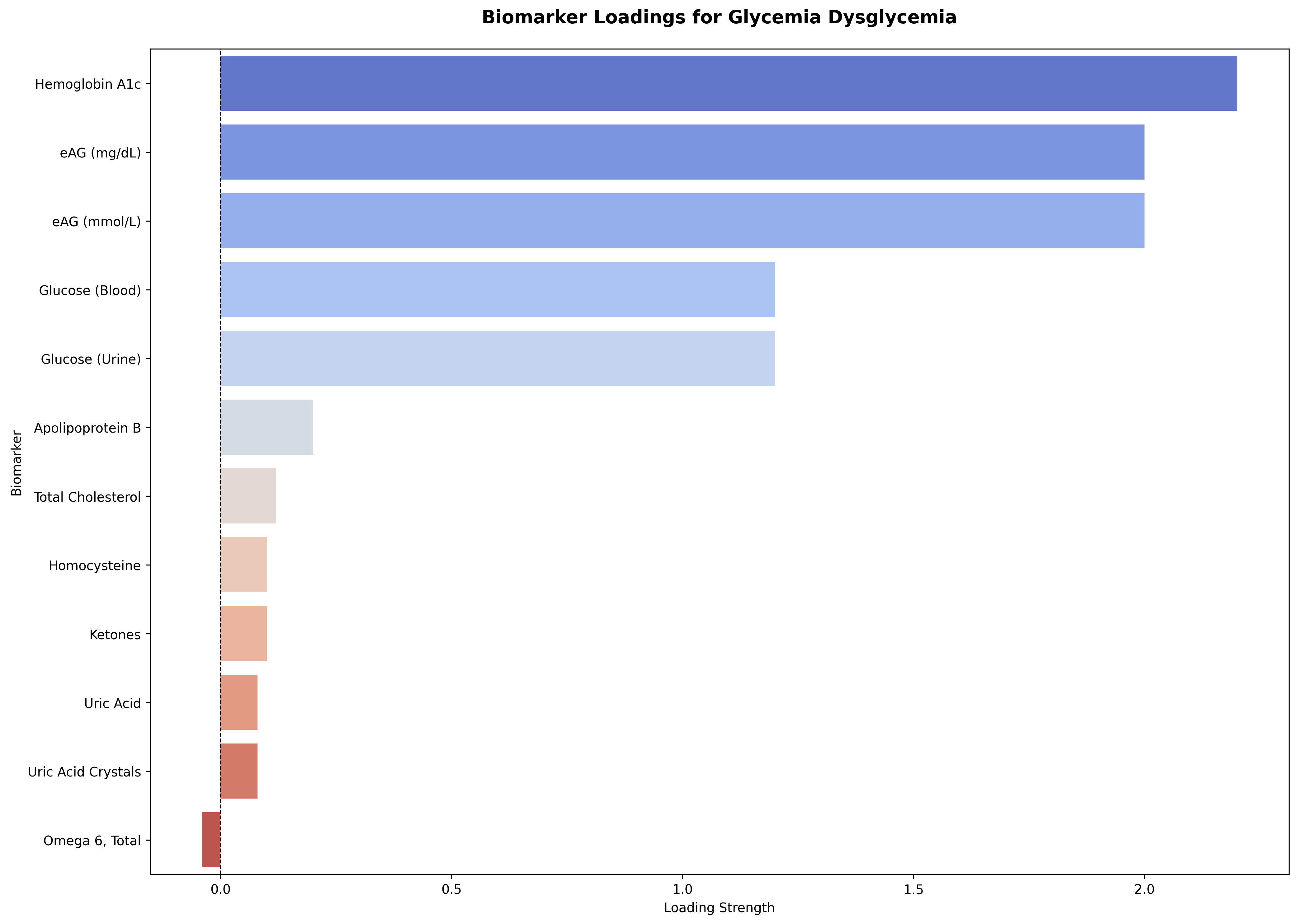 A higher biomarker loading (L(axis, biomarker_b)) indicates that the biomarker’s value more strongly reflects the state of that underlying physiological axis. For the glycemia_dysglycemia axis, as shown below, markers like Hemoglobin A1c and blood glucose show the strongest positive loadings. These biomarkers move tightly with glycemic dysregulation—when the axis rises (indicating poorer glycemic control), these values rise in tandem.