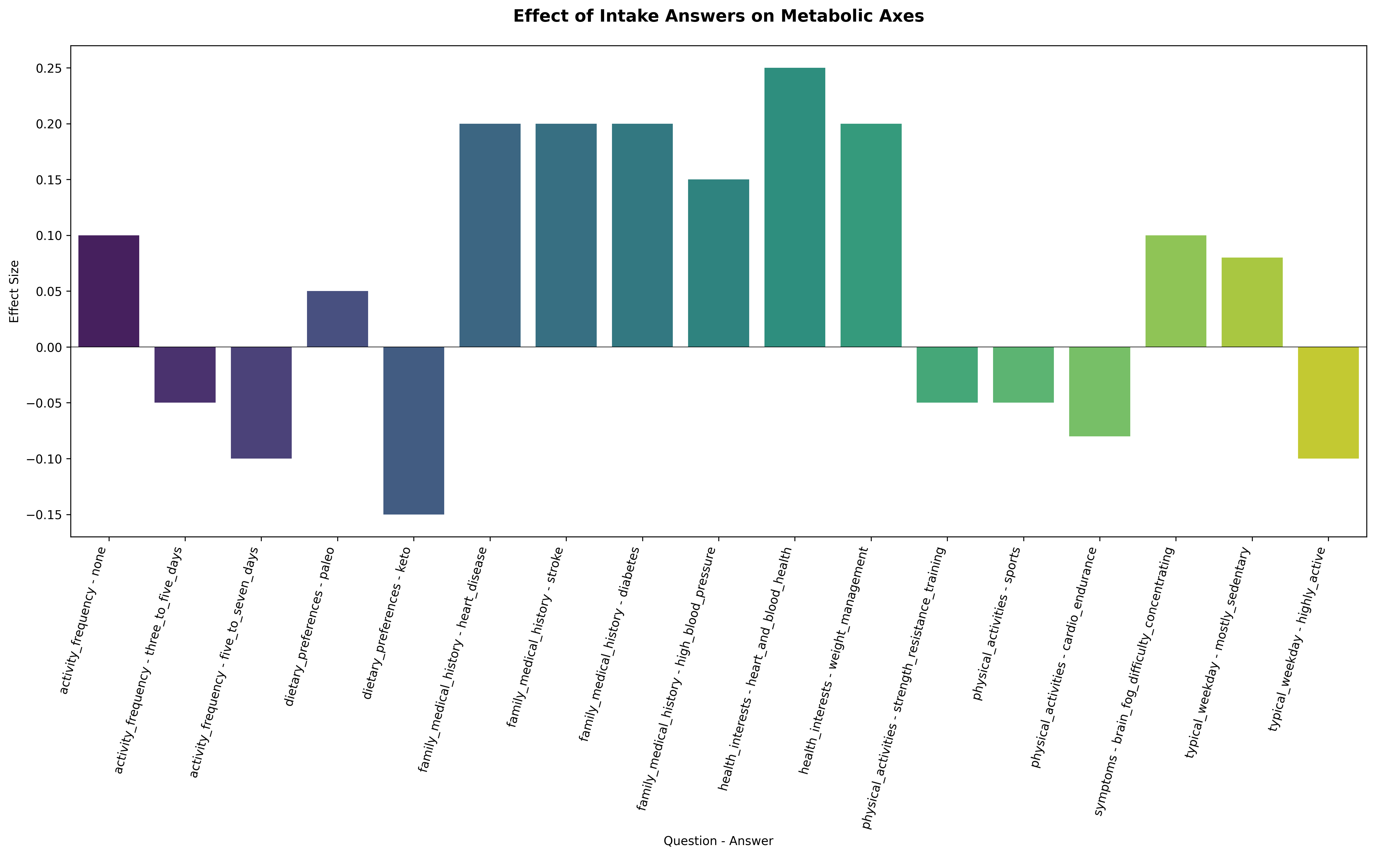 A higher intake-to-axis effect (I(axis, question_j, answer_j)) means that a given lifestyle choice or intake answer has a stronger influence on the corresponding latent axis, shifting that system in a favorable or unfavorable direction. For example, within the glycemia_dysglycemia axis, the effect associated with “Activity = None” is strongly positive, indicating higher dysglycemic pressure, while “Activity = 3–5 days/week” and “Activity = 5–7 days/week” exert progressively more negative effects, reflecting improved insulin sensitivity and better glycemic control through regular exercise, as shown below.