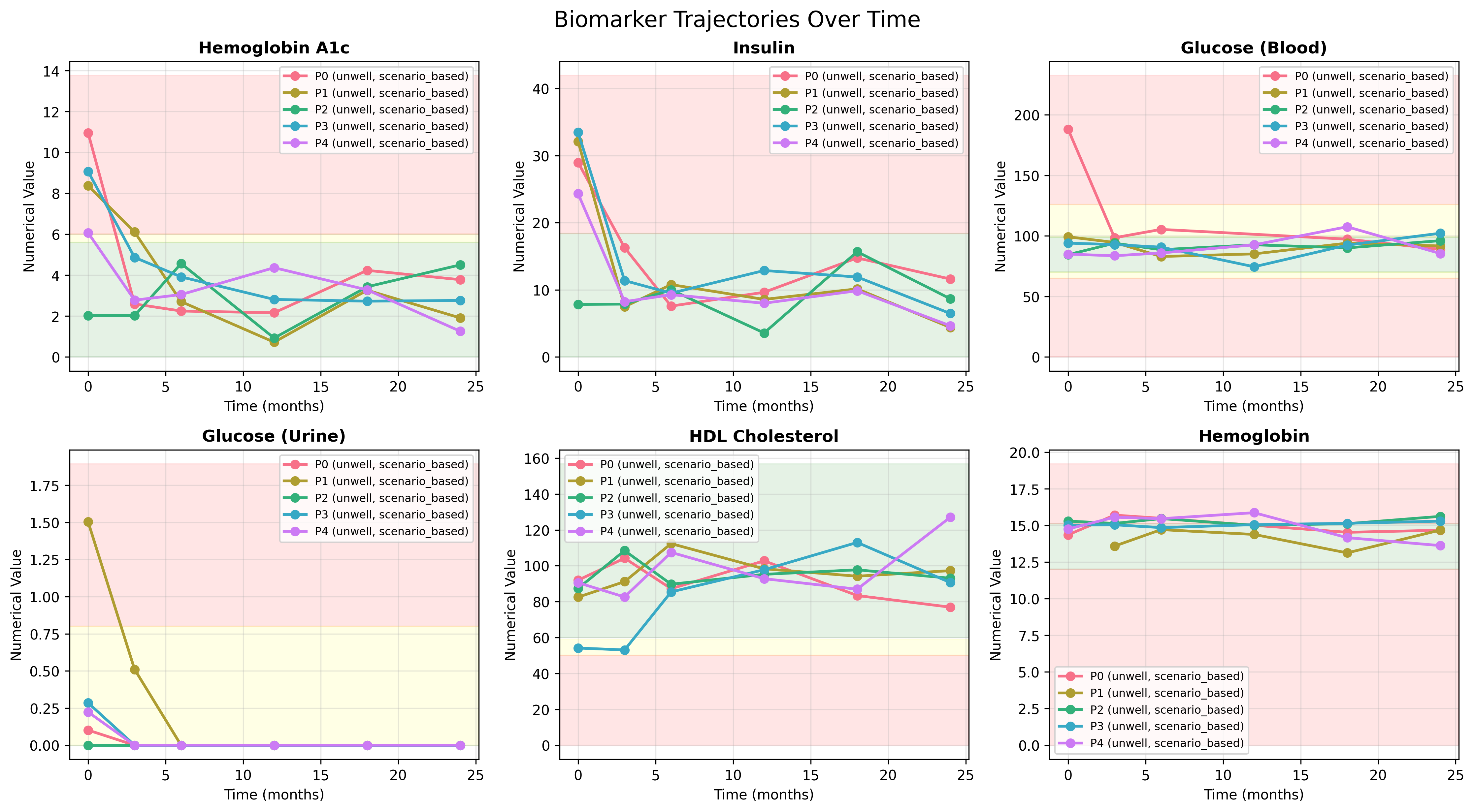 The plots below illustrate how biomarker values evolve when driven by the same latent-axis dynamics across multiple unwell patients under scenario-based trajectories. Each curve represents a simulated patient’s response over a 24-month period.