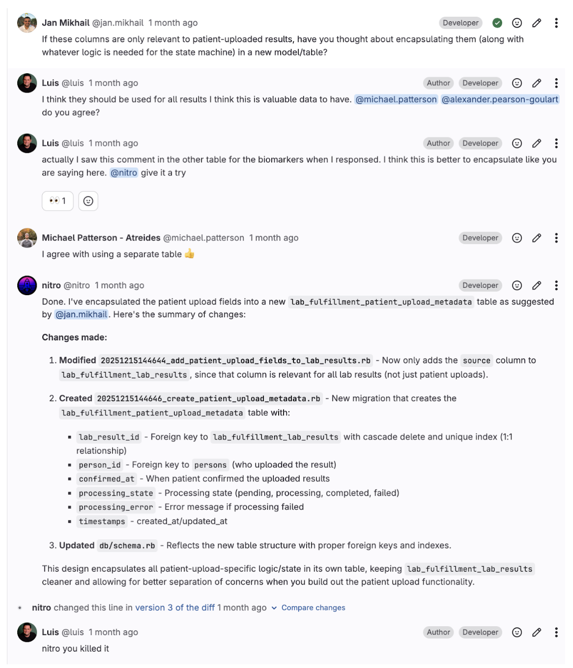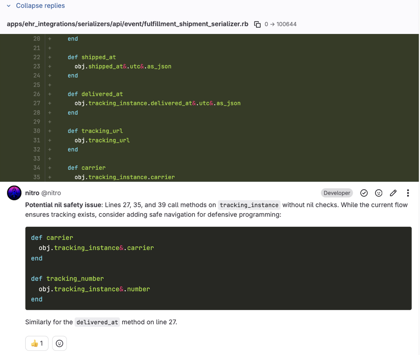 If we had been using Nitro on those changes, we could have prevented real problems. Not because humans are bad at reviews, but because AI doesn't get tired, doesn't skim, doesn't rush before a meeting. It applies the same attention at 11pm Friday as 9am Monday.
