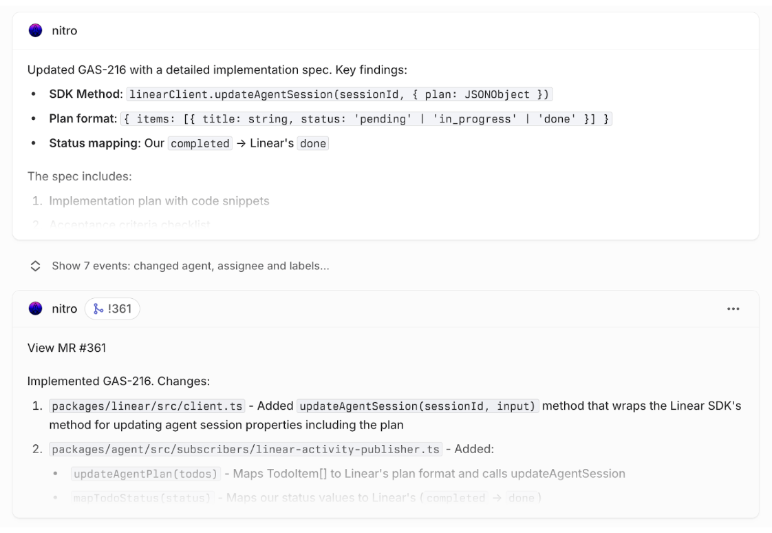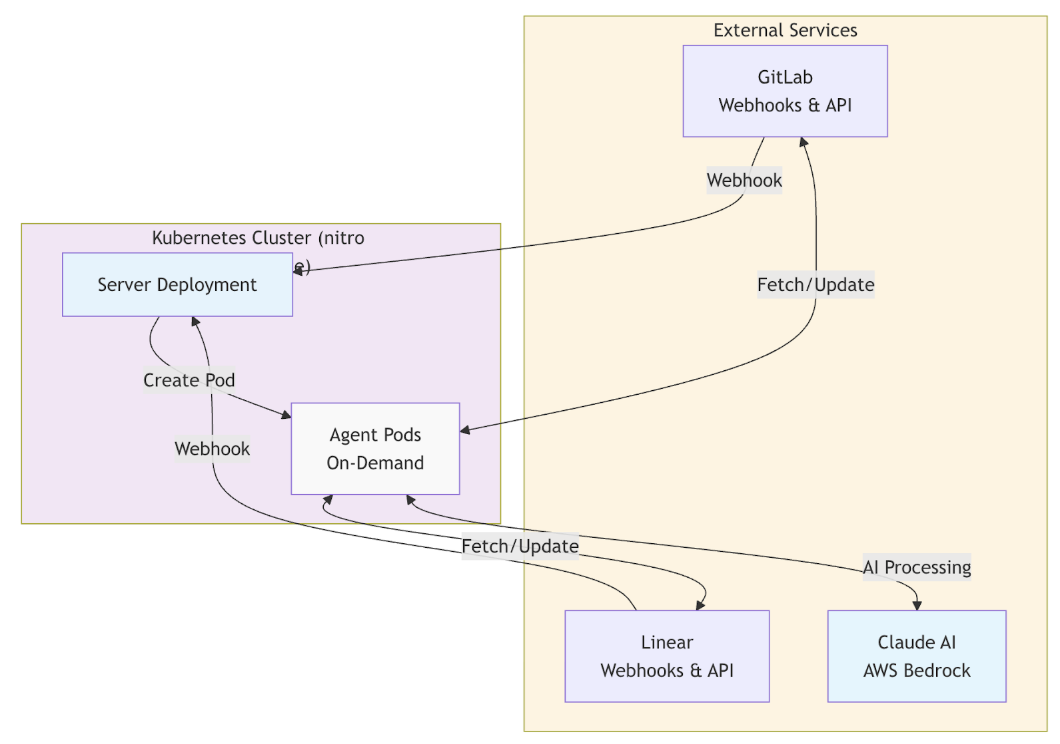 - Webhook-driven. GitLab and Linear events trigger Nitro automatically. Responses post back to the source.