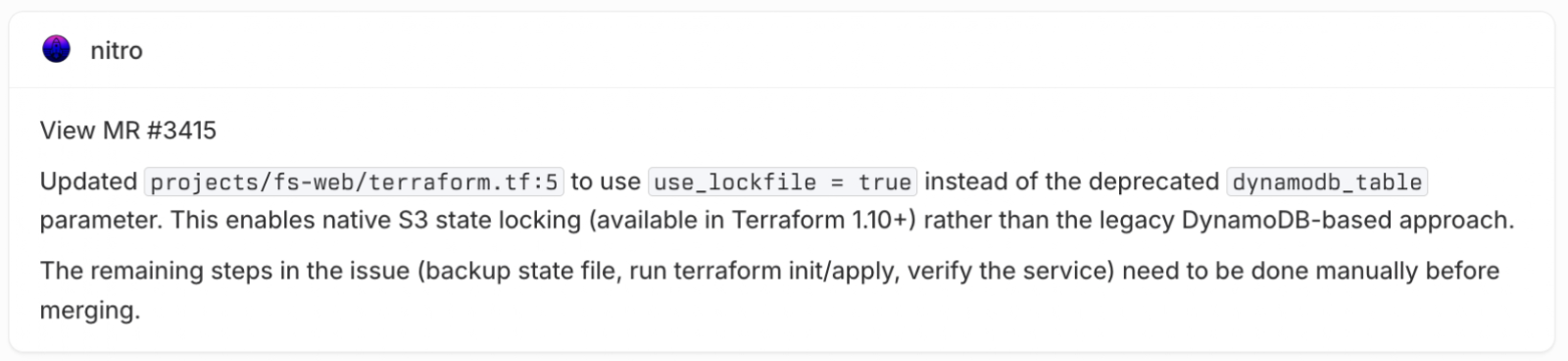 I started by writing up a Linear issue describing the problem context and the solution. Then I applied the required label to my Linear issue to tell Nitro which repository to run in. I assigned the issue to Nitro and watched the ✨magic ✨ unfold. Within moments, the pull request was ready for me in Gitlab, with the exact change I needed to make. This was such a revelation for me: knowing that the time-cost of both making code changes and creating a pull request has been reduced by this degree.